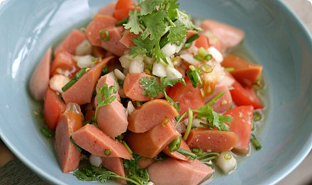 Tưới nước trộn đều lên bát xúc xích, trộn nhẹ nhàng, xúc ra đĩa rắc rau mùi lên trên và thưởng thức